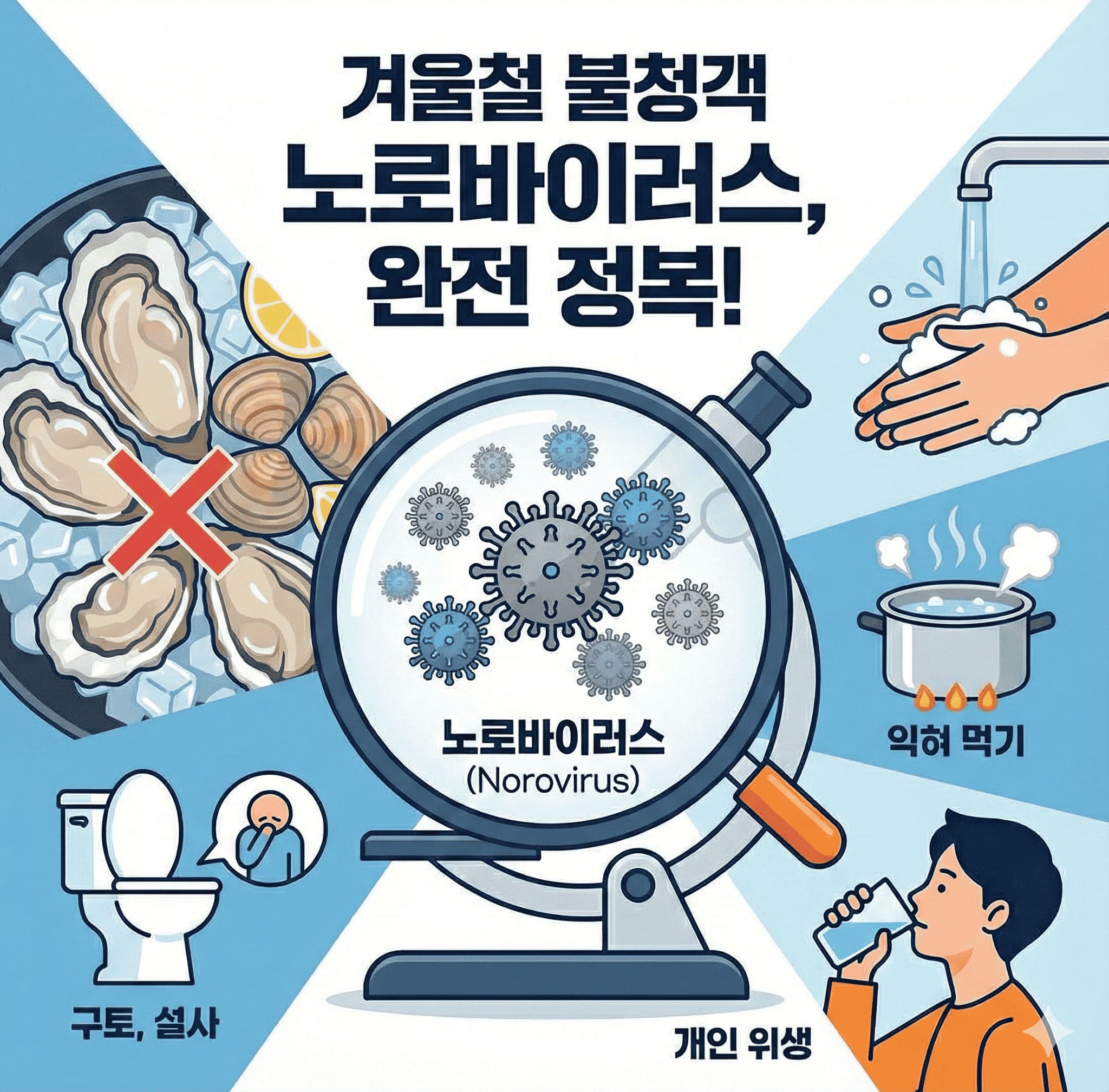 노로바이러스는 전염력이 매우 강하고 감염되면 고통스럽지만, 철저한 개인위생 관리로 충분히 예방할 수 있는 질환입니다. 겨울철에는 특히 손 씻기를 생활화하고, 생굴 섭취를 자제하며, 의심 증상이 나타나면 즉시 격리하는 것이 중요합니다.